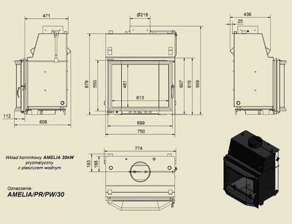 Топка с водяным контуром AMELIA/PR/PW/30, призматическое стекло