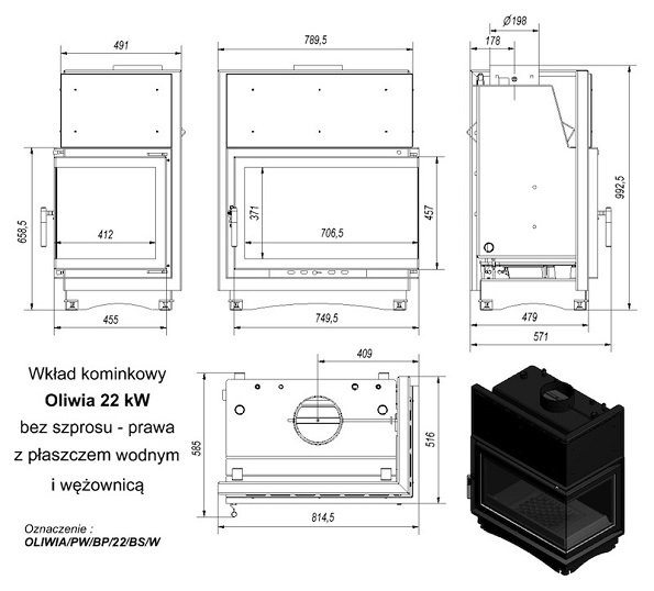 Топка с водяным контуром OLIWIA/PW/BP/22/W, Г-образное стекло справа, змеевик