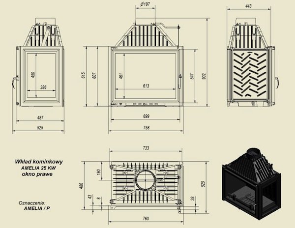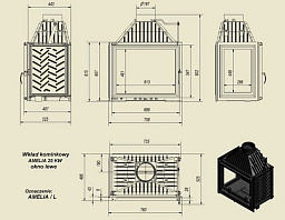Чугунная вставка с каминную облицовку с боковым стеклом справа. На передней части топи расположен рычажок, которым можно регулировать поток воздуха в дымоход. Amelia обладает высокой мощьностью (25 кВт), что достаточно, чтобы согреть дом в 200-250 м2.