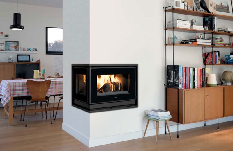 Угловая каминная топка с боковым стеклом справа.