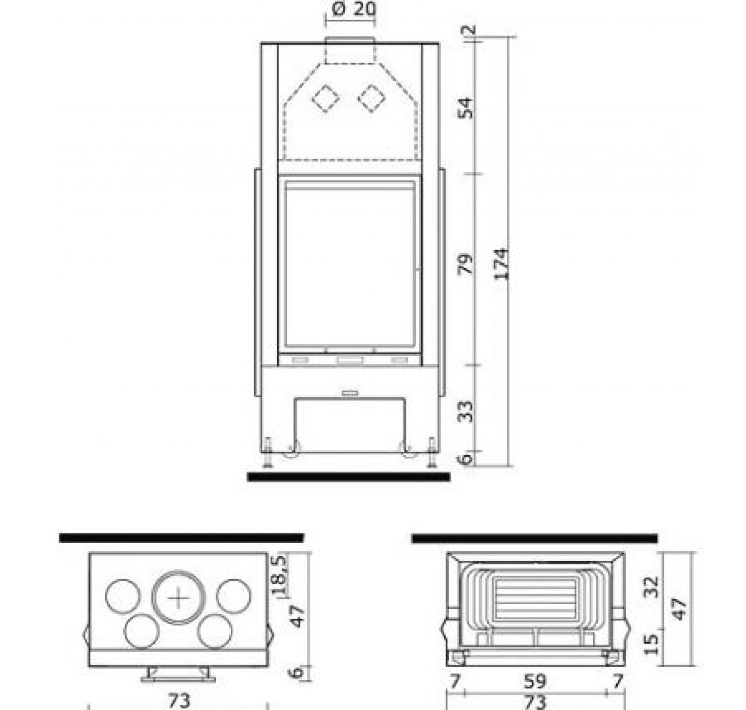 Предусмотрены 4 отверстия в кожухе топки для подключения к системе разводки горячего воздуха. Топка укомплектована системой двойного дожига.