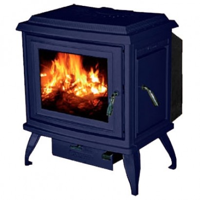 Печь с фронтальной и боковой дверцами, имеет систему Чистое стекло, ручка дверцы не нагревается в процессе топки. Печь покрыта эмалью, цвет - синий.