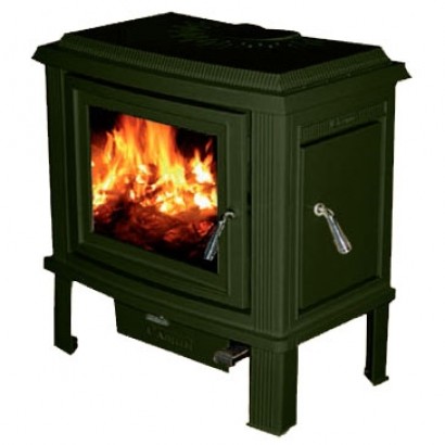 Печь с фронтальной и боковой дверцами, имеет систему Чистое стекло, ручка дверцы не нагревается в процессе топки. Печь покрыта эмалью, цвет - зеленый.