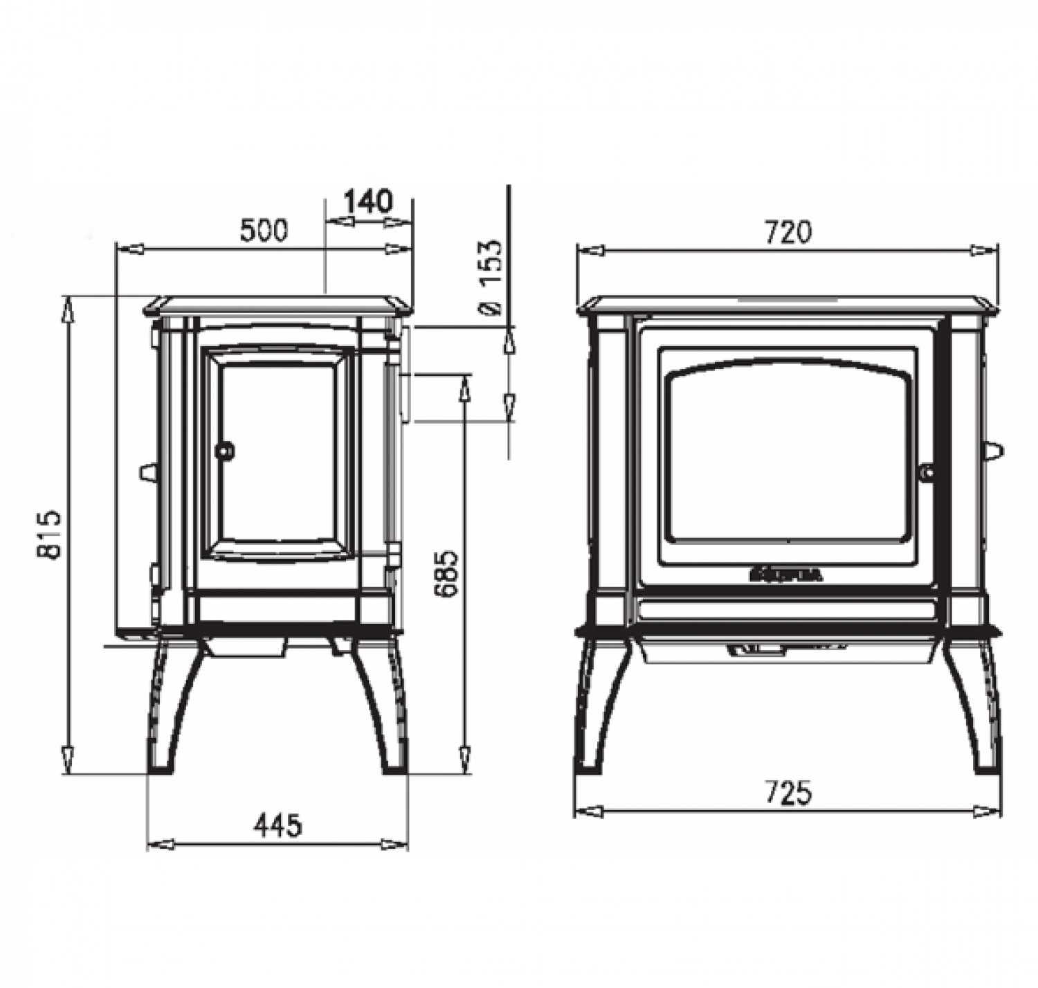 Отопительная печь имеет топку полузакрытого типа, в которой можно сжигать дрова или брикеты лигнита (бурого угля). Печь устанавливается рядом со стеной. Подсоединение к дымоходу производится при помощи труб, соответствующих стандарту NFD 35-302 и изготовленных из эмалированной жести или нержавеющей стали. Данная печь может подсоединяться к своему, отдельному дымоходу.