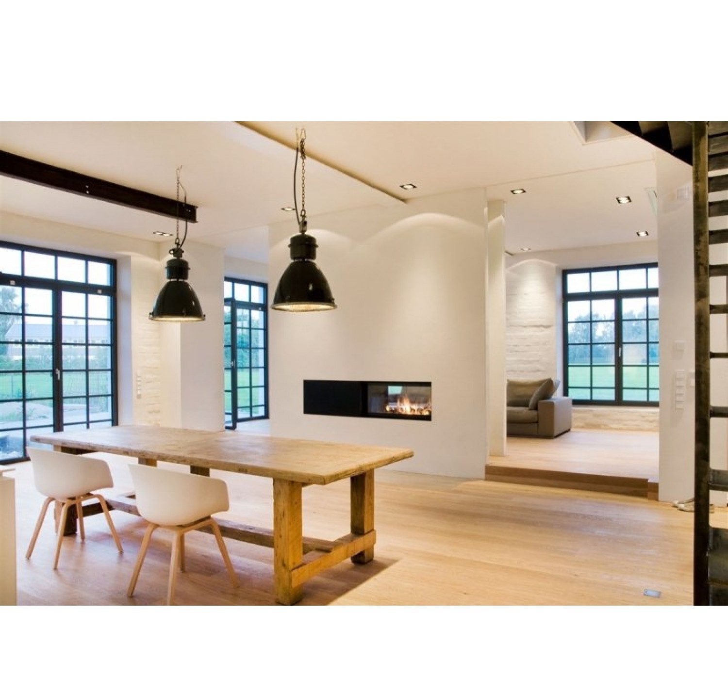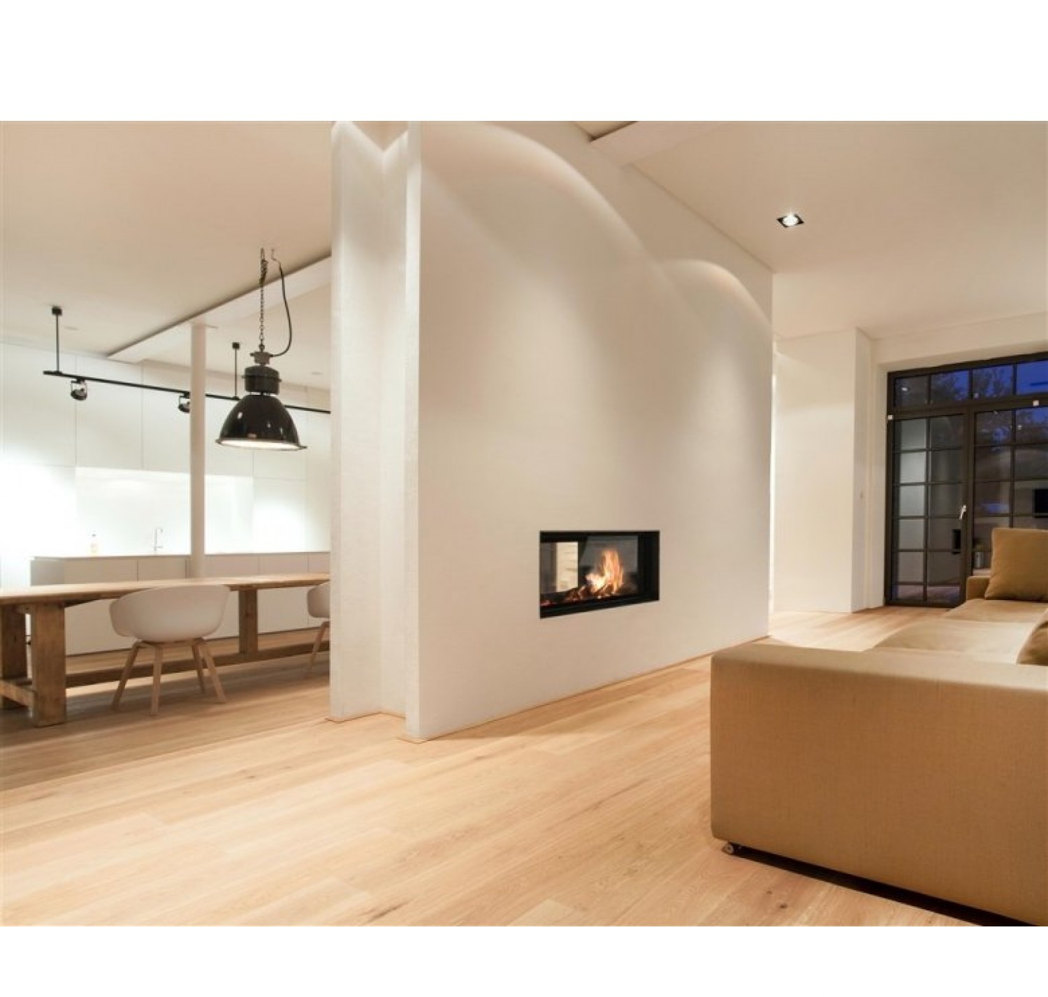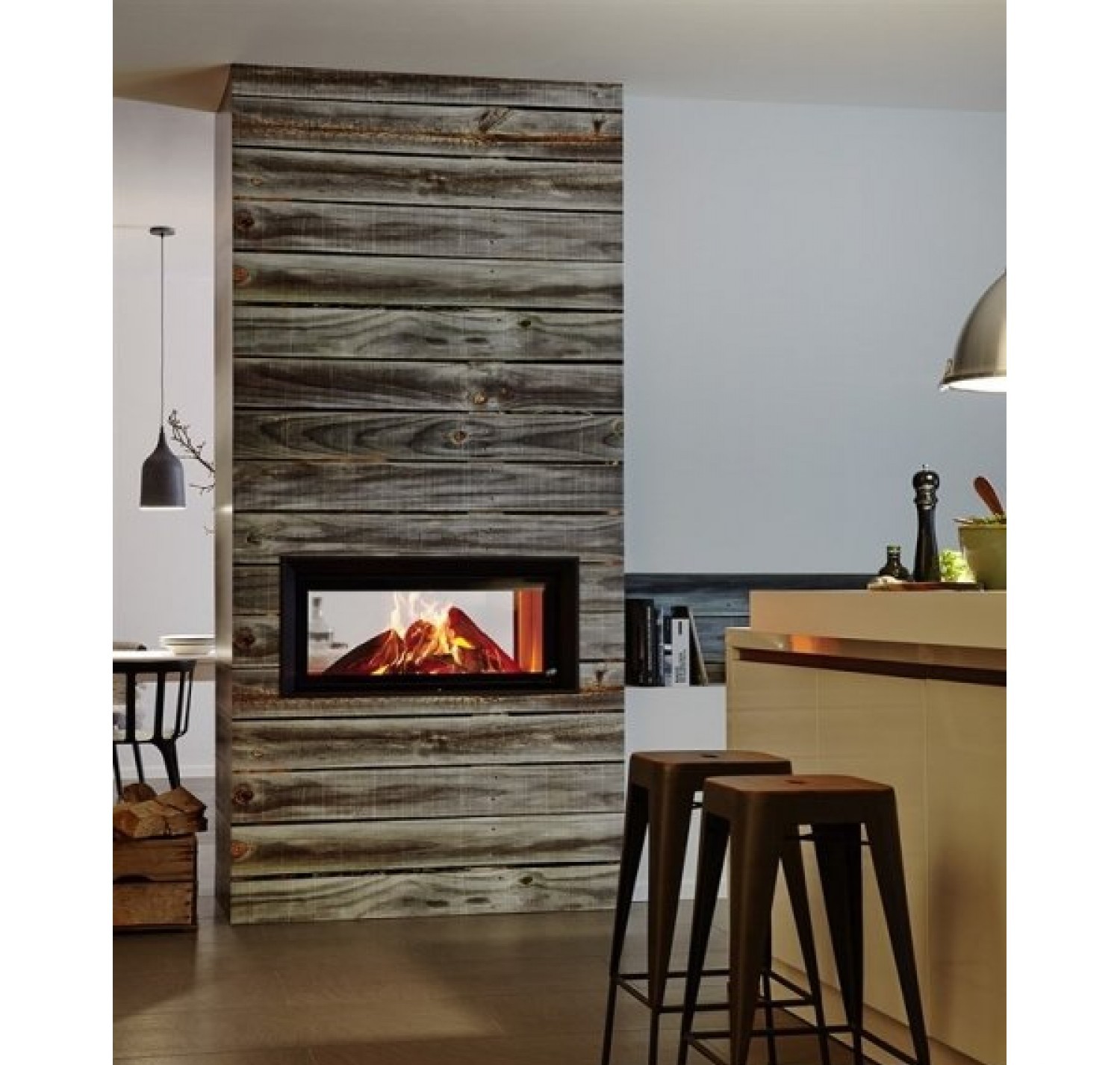 Двухсторонняя каминная топка с прямым стеклом. Топочная камера футерована шамотом. Подъёмный механизм двери (система Easy-Lift) с одной стороны. С другой стороны дверца откидывается для чистки.