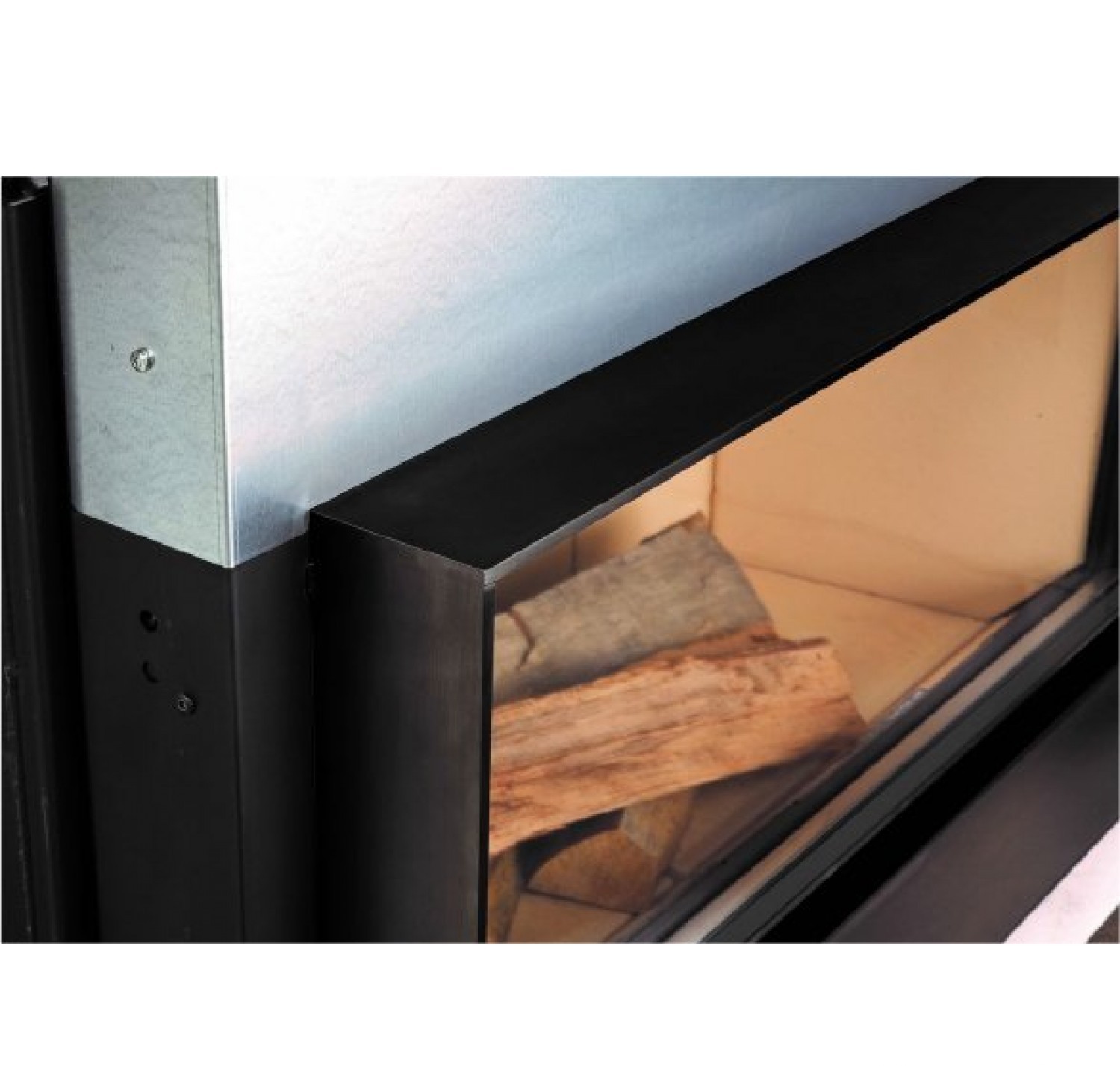 Двухсторонняя каминная топка с прямым стеклом. Топочная камера футерована шамотом. Подъёмный механизм двери (система Easy-Lift) с одной стороны. С другой стороны дверца откидывается для чистки. Ширина дверки 981 мм. Высота дверки 422 мм. Возможно подключение воздуха извне.