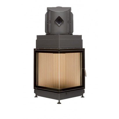 Угловая каминная топка с Г-образным стеклом. Топочная камера футерована шамотом. Ширина дверки 506+506 мм. Высота дверки 548 мм. Возможно подключение воздуха извне.