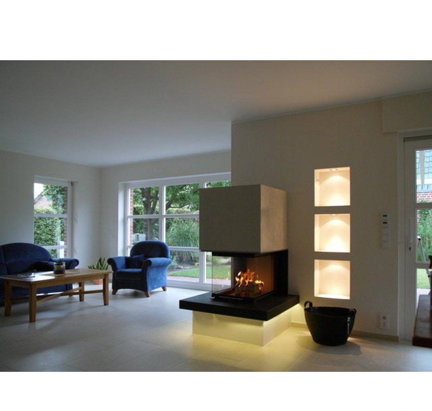 Трёхсторонняя каминная топка. Топочная камера футерована шамотом. Подъёмный механизм двери (система Easy-Lift). Ширина дверки 904+505+904 мм. Высота дверки 479 мм. Возможно подключение воздуха извне.