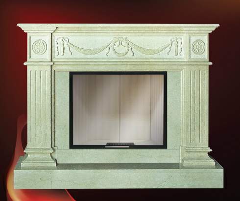 При выполнении данной облицовки применяется натуральный камень. Оформление в виде художественной резьбы придает камину неповторимый и уникальный вид.