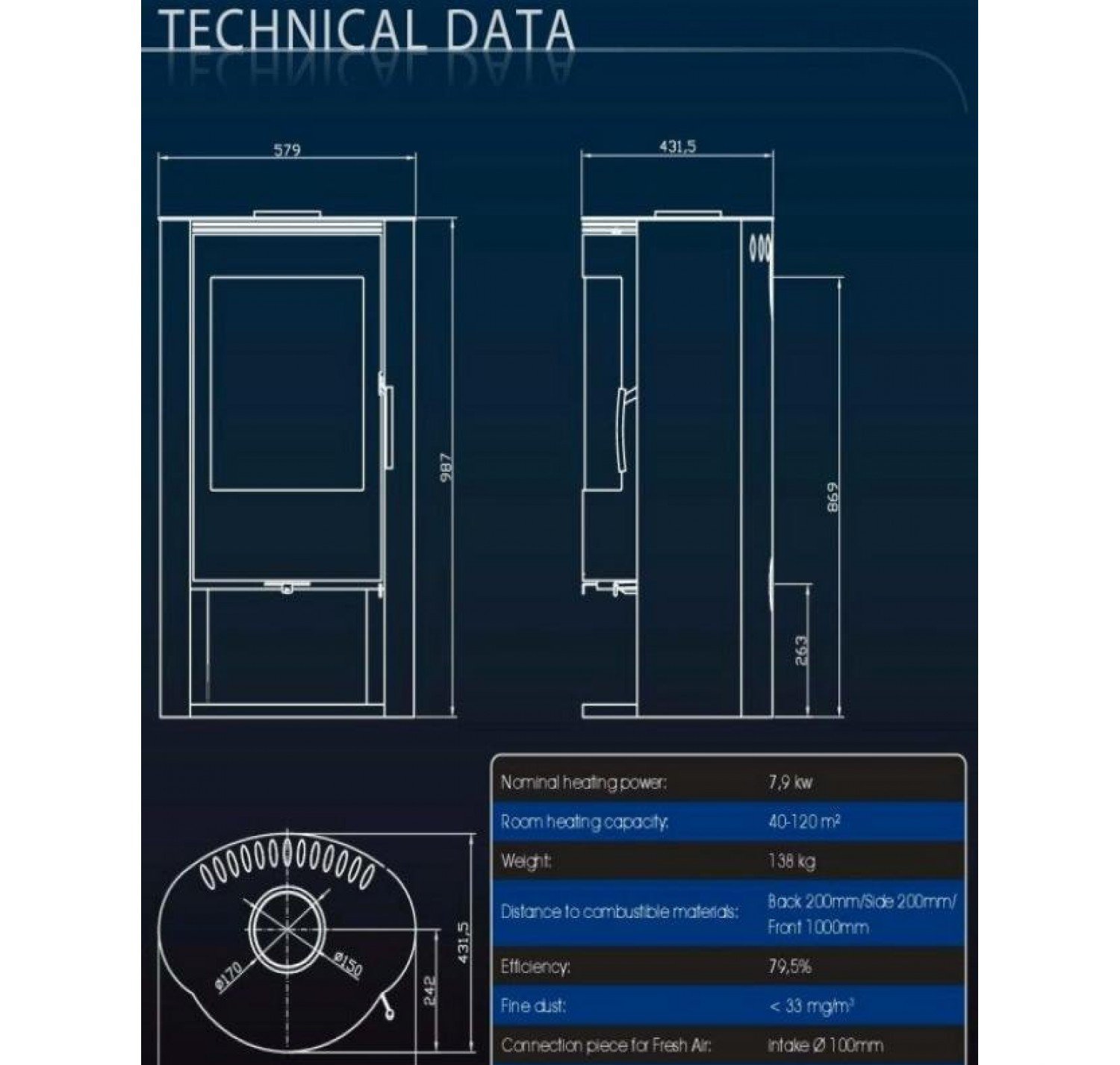 - Диаметр дымохода, (мм) 150 мм.