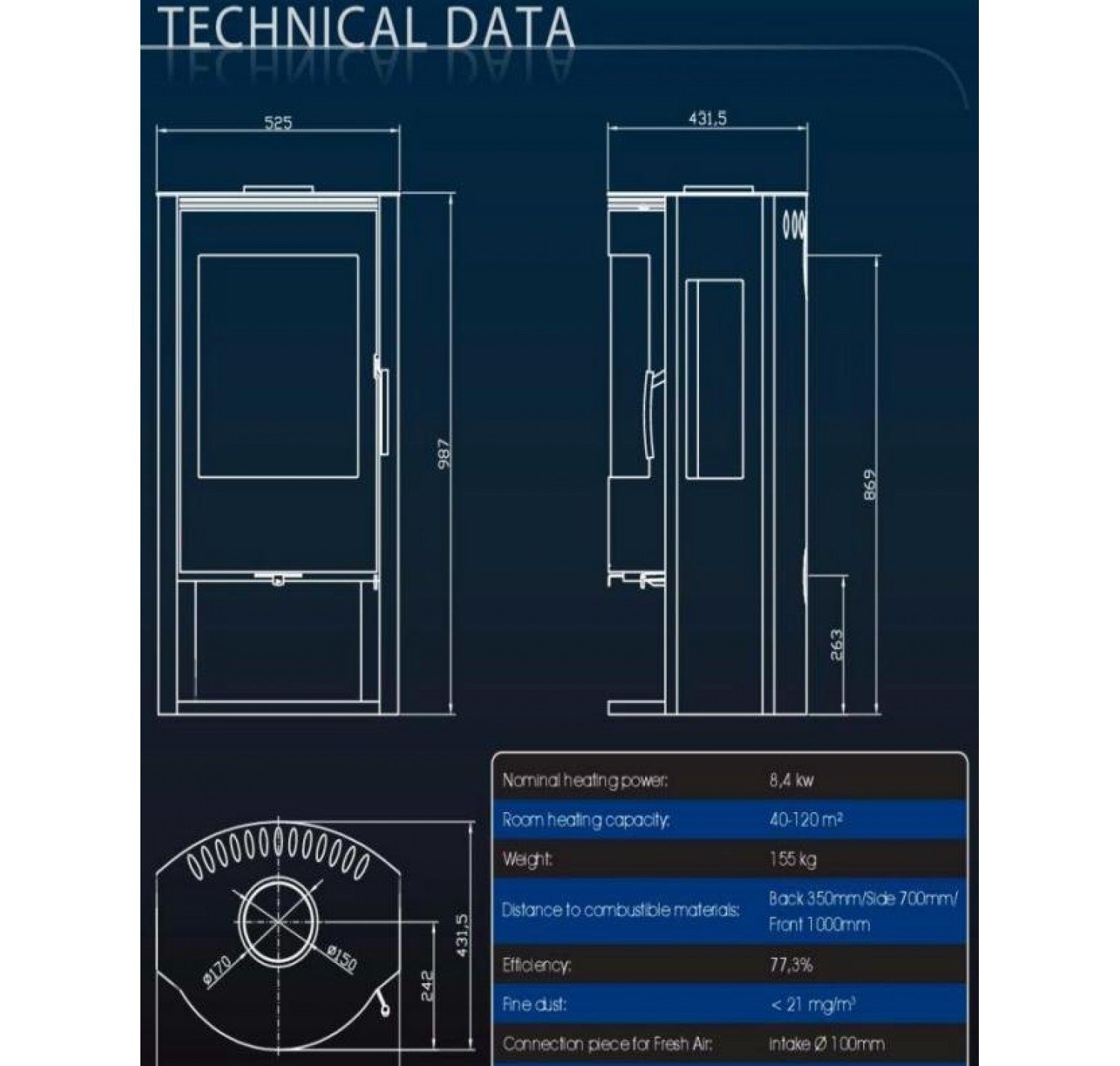 - Диаметр дымохода, (мм) 150 мм.