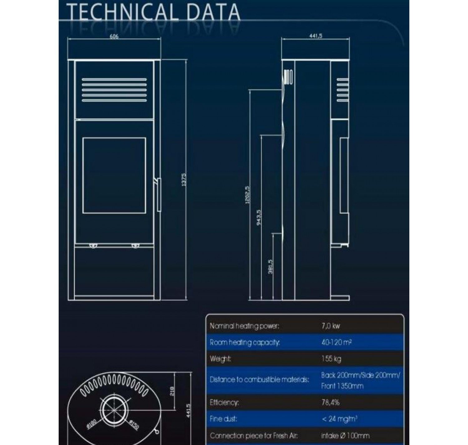 - Диаметр дымохода, (мм) 150 мм.