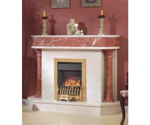 Этот портал привлекает необычным сочетанием мрамора разных цветов. Колонны и верхняя часть фасада этого камина выполнены из кораллового узорчатого мрамора, а пьедестал, передняя часть и обрамление верхней полки - из мрамора нежно-кремового цвета.
