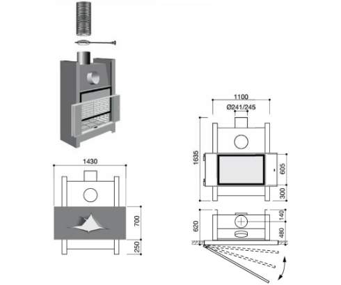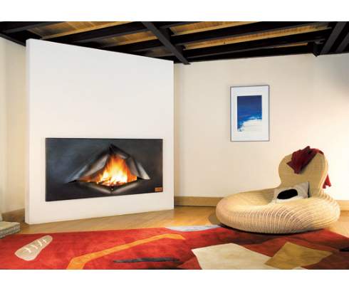 Фасад из неровной, натертой воском стали, открывающийся на петлях, топка из стали, выложенная внутри кирпичом, выдерживает до 1300 градусов. Рама обеспечивает изоляцию от окружающих поверхностей. Эта модель идет в комплектации с открытым фасадом и закрывающейся топкой со съемной стеклянной дверцей. Эта модель должна быть установлена профессионалом (верхние и нижние вентиляторы обязательны).