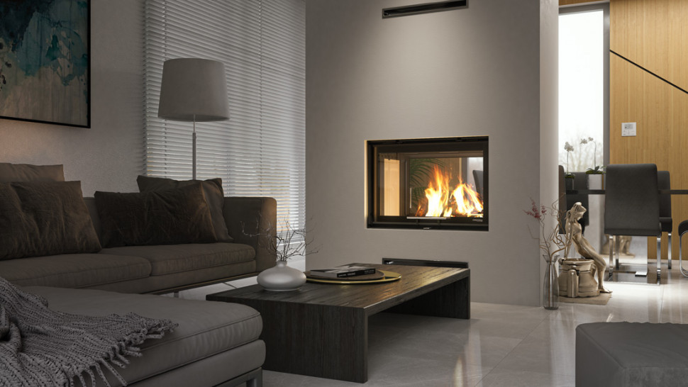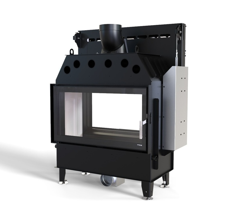Изготовлена из высококачественной стали и предназначена для отопления помещения площадью 70-230 м². Модель имеет 2 дверцы (с вертикальным и боковым открытием) из закаленного стекла, что выдерживает температуру до 800 °С. Благодаря такой конструкции, открывается вид пламени с обох сторон и камин возможно установить в межкомнатных перегородках и наслаждаться видом огня даже в разных комнатах. Дверцы имеют по ручке из качественной нержавеющей стали.