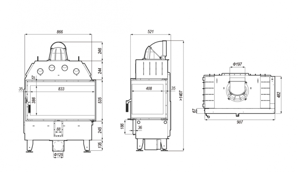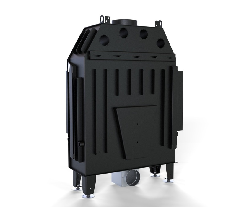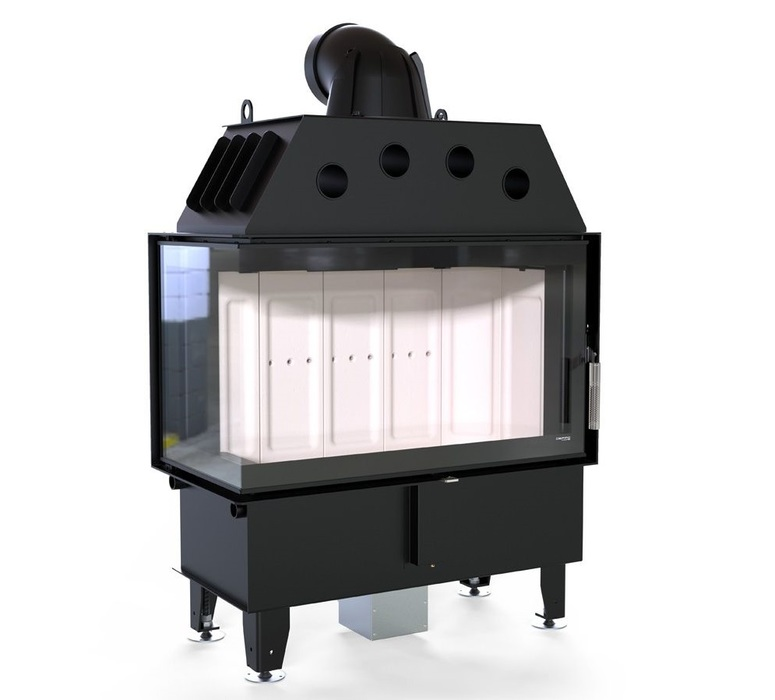 Модель изготовлена из стали с порошковым покрытием. Устройство с центральной подачей воздуха снаружи и возможностью ее регулировки. Специальная конструкция на трубе для подачи воздуха в топку, дает возможность изменить направление подачи воздуха на боковое. Плотно размещенные радиаторы способствуют передачи больше тепла окружающей среде, а воздуховоды повышают эффективность камина.