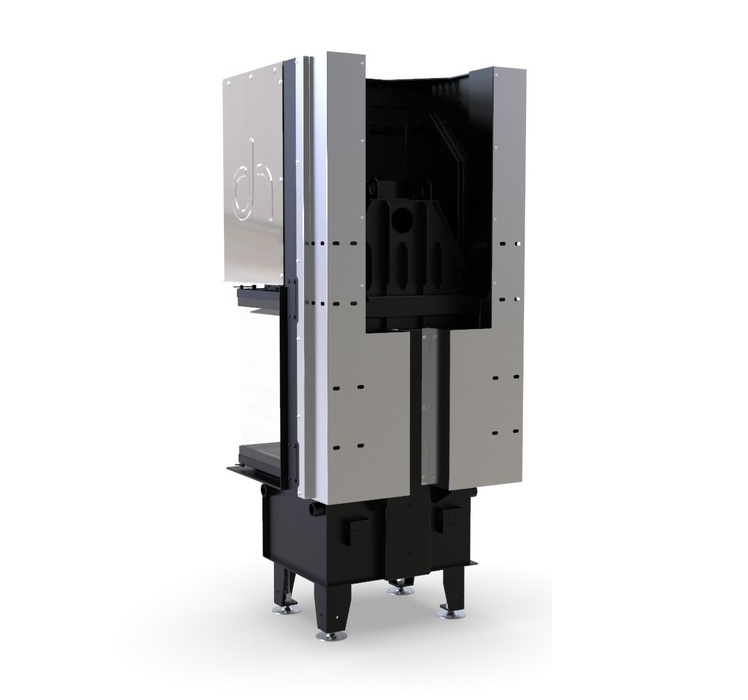 Внутри топочная камера футерована толстыми панелями из специального керамического сплава белого цвета. Характеристики топки (вторичный дожег, поворотный дымовой патрубок, подвод воздуха из вне, система «чистое стекло»), делают работу камина качественной и экономично расходуются дрова.