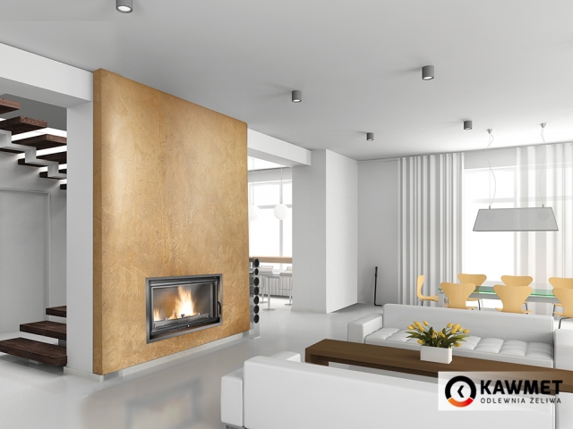 Для защиты корпуса каминной топки в конструкции топочной камеры также установлена двойная задняя стенка с красивым и объёмным рисунком, которая обеспечивает долговечность каминных топок KAWMET.