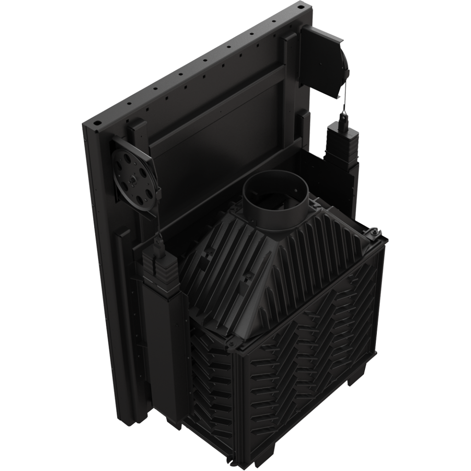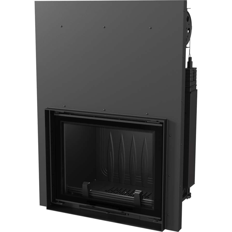 - Дверцы топки работают в системе lift up - стеклянная панель поднимается вверх. Эта система была построена, опираясь в противовес - два блока (по обоим сторонам двери) со стальной рейкой работают в направляющих на двух несущих роликах, благодаря чему вес двери равномерно распределяется. Они движутся вдоль на огнеупорных роликах, установленных в дверной раме, что гарантирует их лёгкое, тихое и бесперебойное функционирование. Движение дверец происходит на расстоянии пару миллиметров от корпуса, что предотвращает повреждение герметизации. Дверцы, которые закрываются, с большой силой погружаются в дверную раму, благодаря чему камера сгорания есть полностью герметичной.