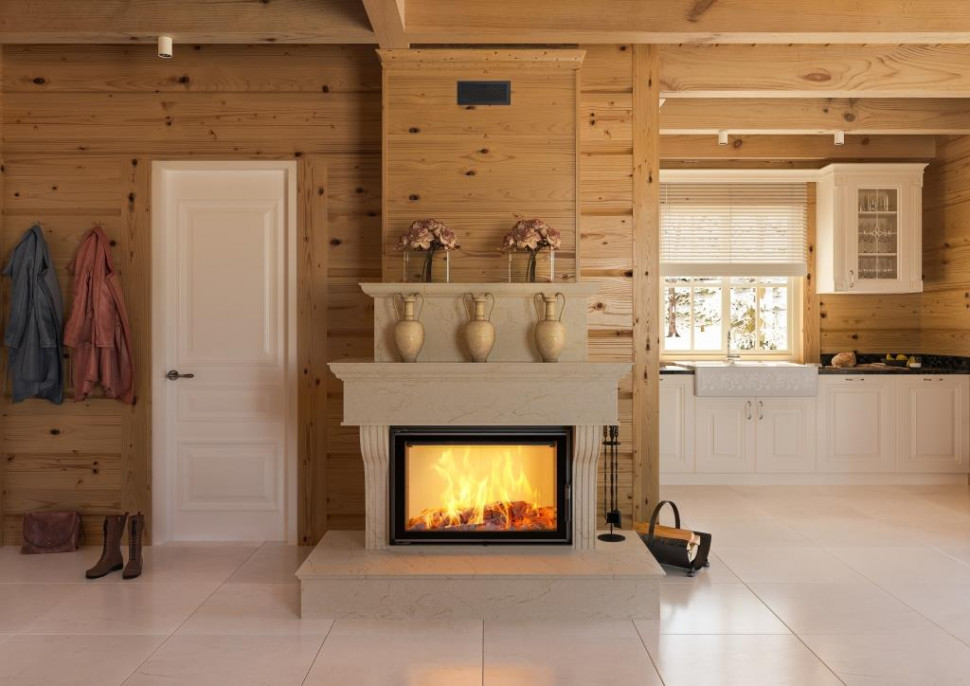 - Кроме того, для топки используется система чистого стекла (воздушная завеса), то есть воздух подается прямо на стекло через систему каналов, расположенных по бокам камина. Таким образом, кислород поступает в верхнюю часть камеры сгорания, где происходит сгорание газов, возникших в процессе сжигания дров, что дополнительно уменьшает выброс вредного СО в атмосферу.
