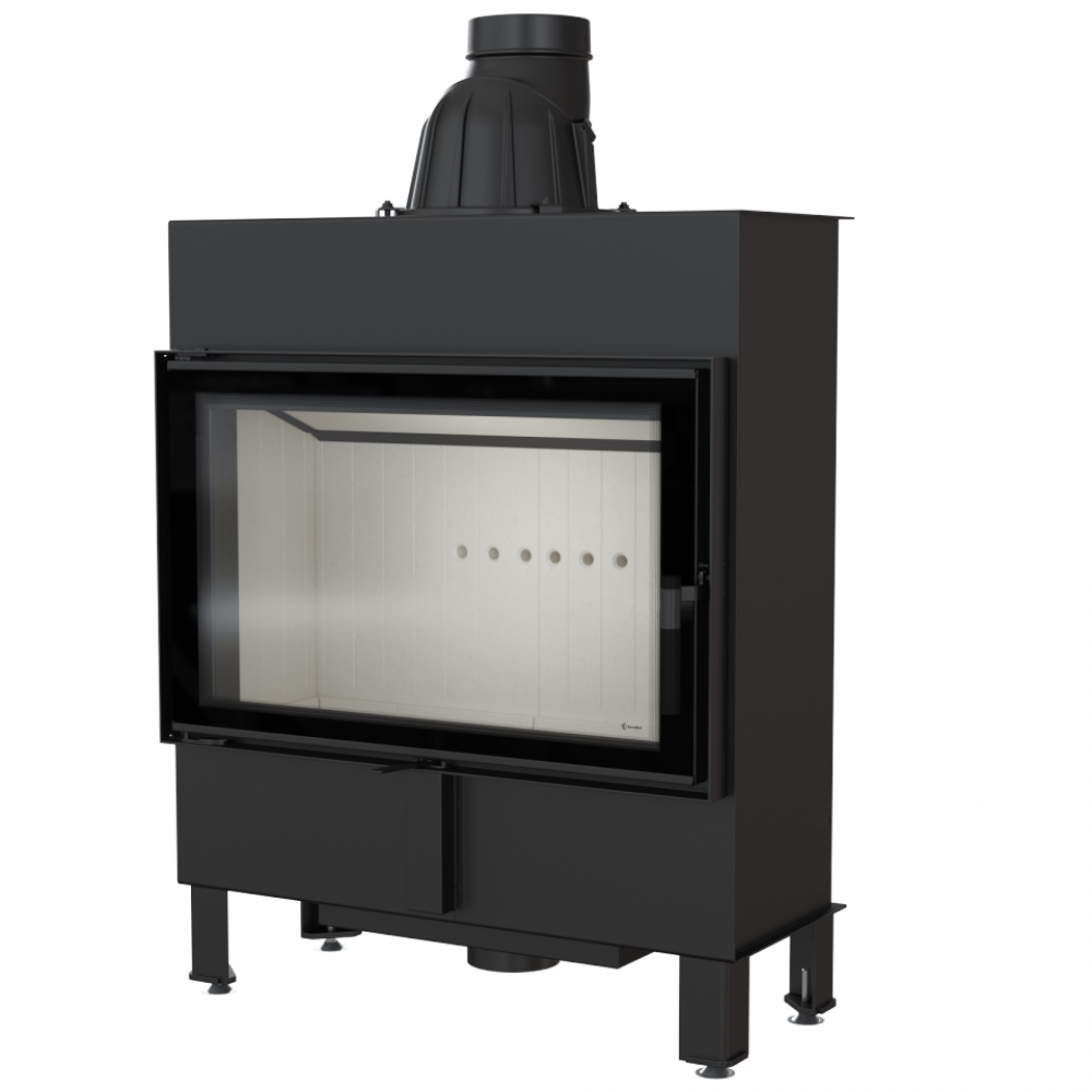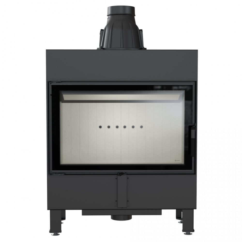 - Модель оснащена подвижным дымоходным отверстием, так что во время монтажа нет необходимости покупать дополнительные колена. Можно легко подобрать угол подключения топки к каминной инсталляции.