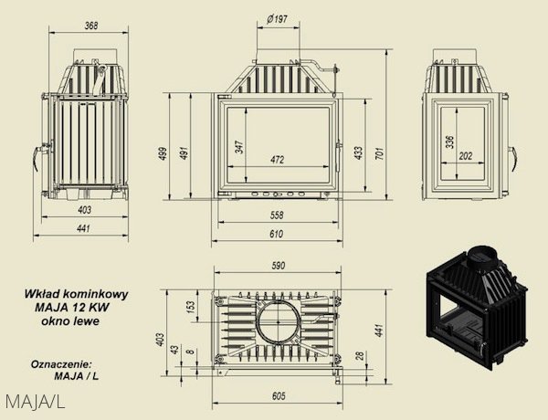 Топка для камина непрерывного сгорания серии Kratki Maja/L (стекло слева) – чугунная топка от польских мастеров из компании Kratki. Европейское качество, традиционный материал (чугун), небольшая мощность и привлекательная цена – отличие оборудования Maja.
