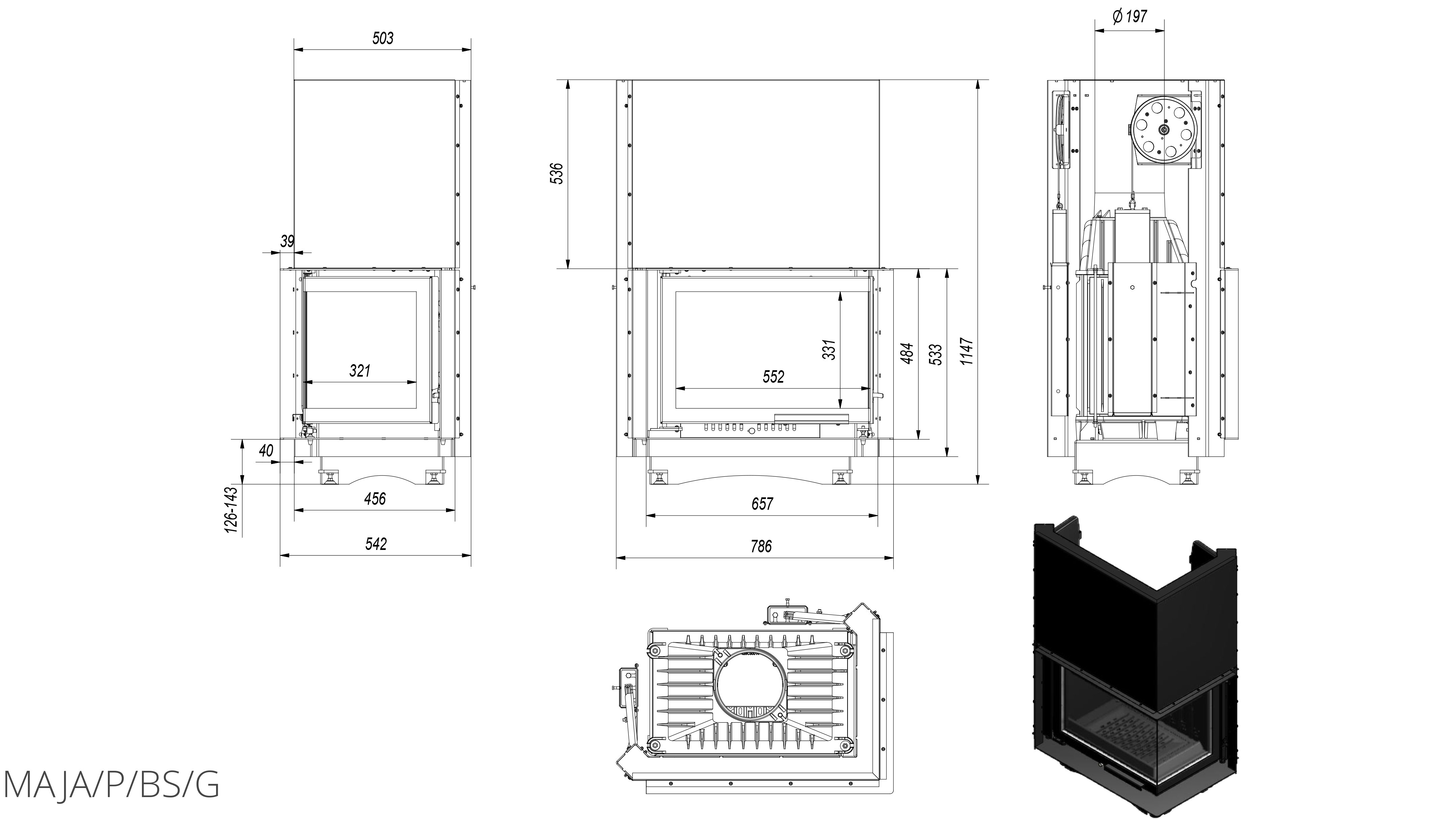 Топка для камина непрерывного сгорания серии Maja/P/BS/G (Г-образное стекло справа, гильотина) – угловая топка с гильотинным механизмом от польской компании Kratki. Представленный вариант исполнения топочной камеры подойдет для углового монтажа – компания Kratki предлагает своим покупателям максимальное разнообразие исполнений вполне традиционной встраиваемой топочной камеры.