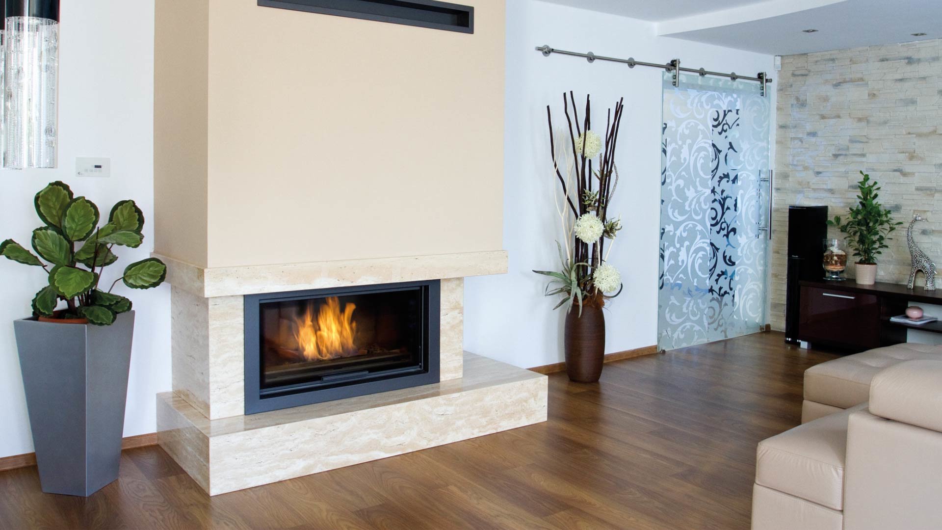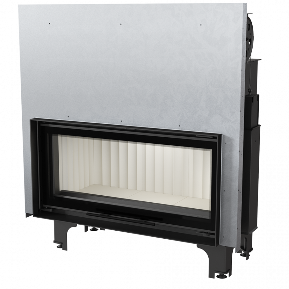 • Декоративная стеклянная панель типа glass, которая выдерживает температуру до 660 °C и предоставляет камину современный и элегантный вид, оптически увеличивает переднюю часть топки.