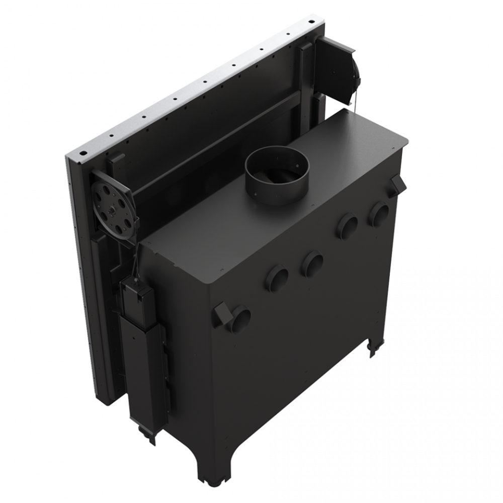 • Дверцы топки работают в системе lift up - стеклянная панель поднимается вверх. Эта система была построена, опираясь в противовес - два блока (по обоим сторонам двери) со стальной рейкой работают в направляющих на двух несущих роликах, благодаря чему вес двери равномерно распределяется. Они движутся вдоль на огнеупорных роликах, установленных в дверной раме, что гарантирует их лёгкое, тихое и бесперебойное функционирование. Движение дверец происходит на расстоянии пару миллиметров от корпуса, что предотвращает повреждение герметизации. Дверцы, которые закрываются, с большой силой погружаются в дверную раму, благодаря чему камера сгорания есть полностью герметичной.
