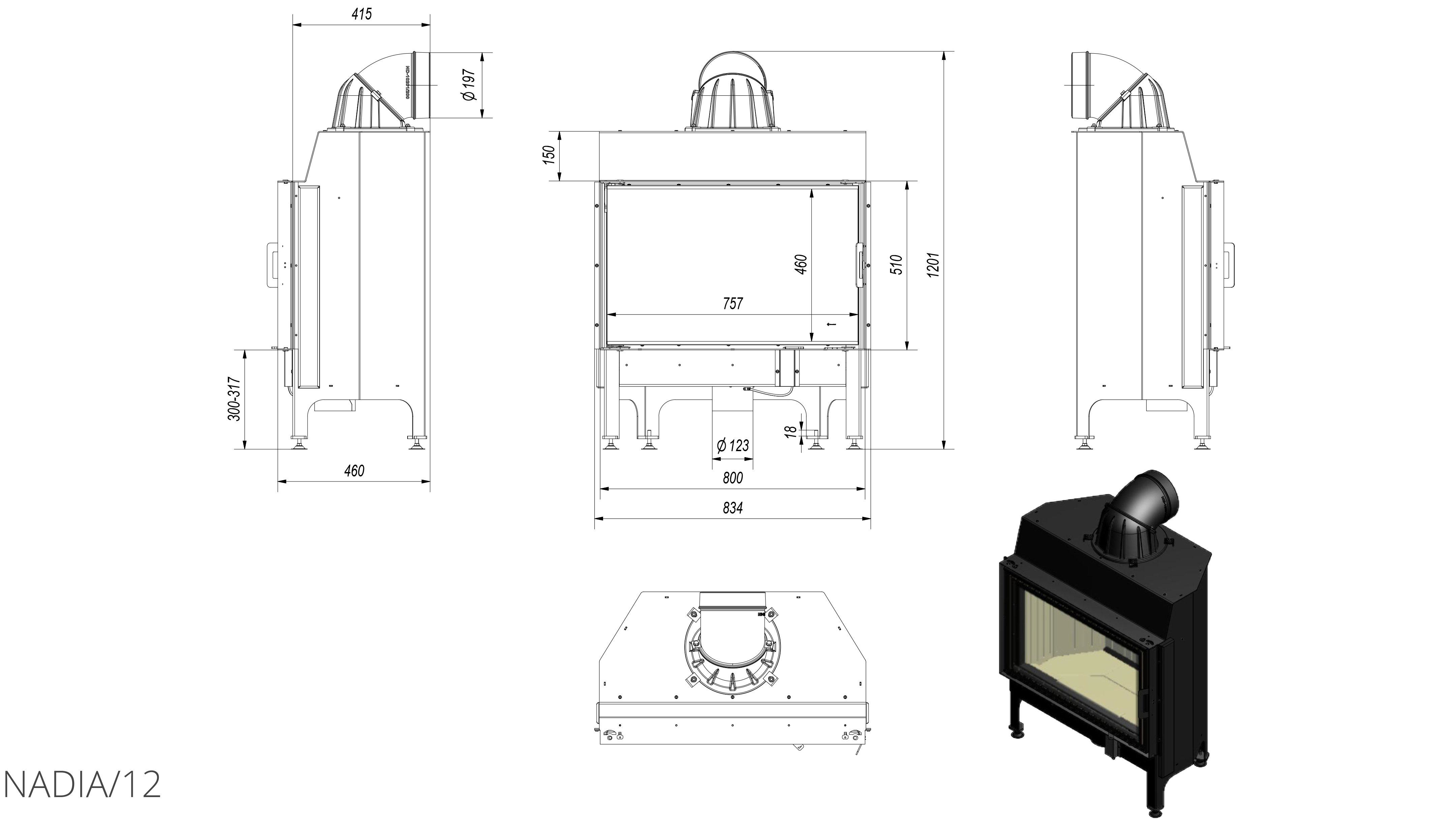 Nadia является футеровкой с корпусом и передним картриджем, которые изготовлены из стальных листов, благодаря чему подходят для эксплуатации в условиях повышенных температур. Представленная модель обеспечена декоративным стеклом, которое выдерживает очень высокую температуру, оно покрыто методом трафаретной печати , который обеспечивает камину современный и очень элегантный внешний вид.