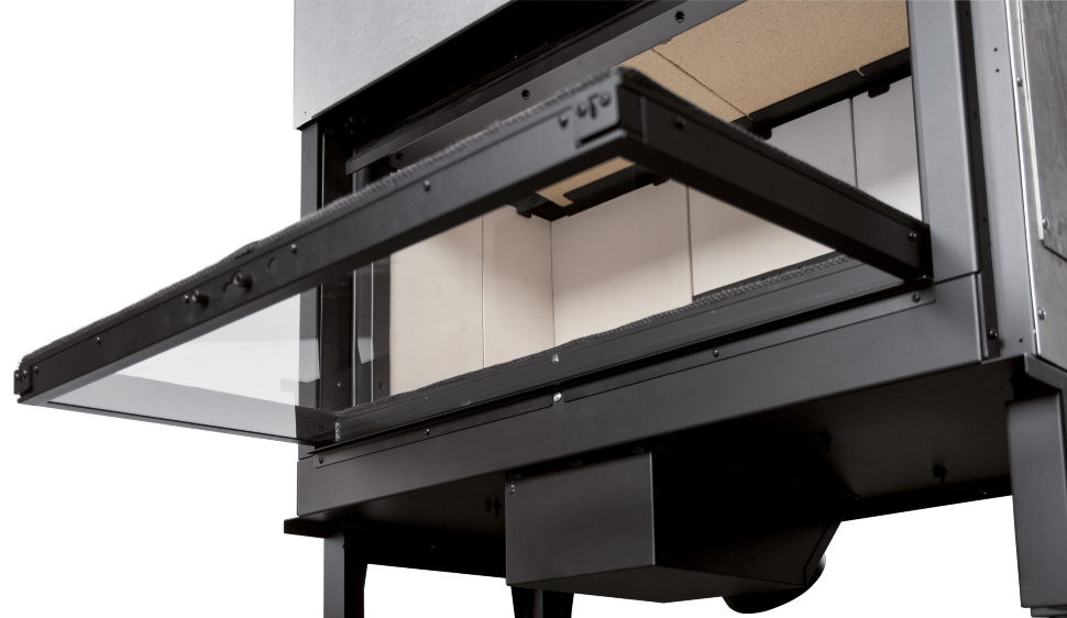 - Система очистки стекла — представляет собой специальный канал-воздуховод над дверцей топочной камеры, куда подается дополнительная порция кислорода, за счёт которой происходит сгорание частиц топлива на поверхности стекла и оно остаётся чистым.