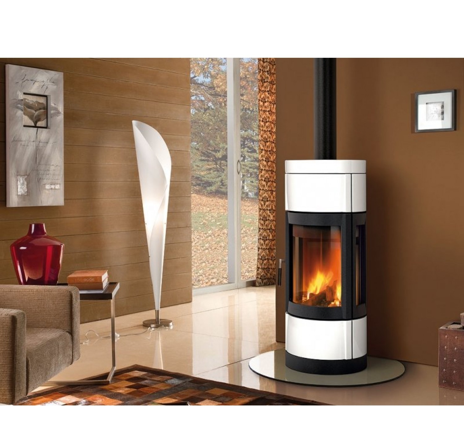 Возможные варианты цвета: белый и красный. Есть сиcтемы первичного воздуха, вторичного воздуха и третичного воздуха. Изогнутые дверцы топки сделаны из керамического стекла. Керамические детали выдерживают до 750°C. Представленная печь-камин на вращающемся основании (Угол вращения - 90 °). Наружные плиты изготовлены из майолики (цвет - бордо, белый инфинити).