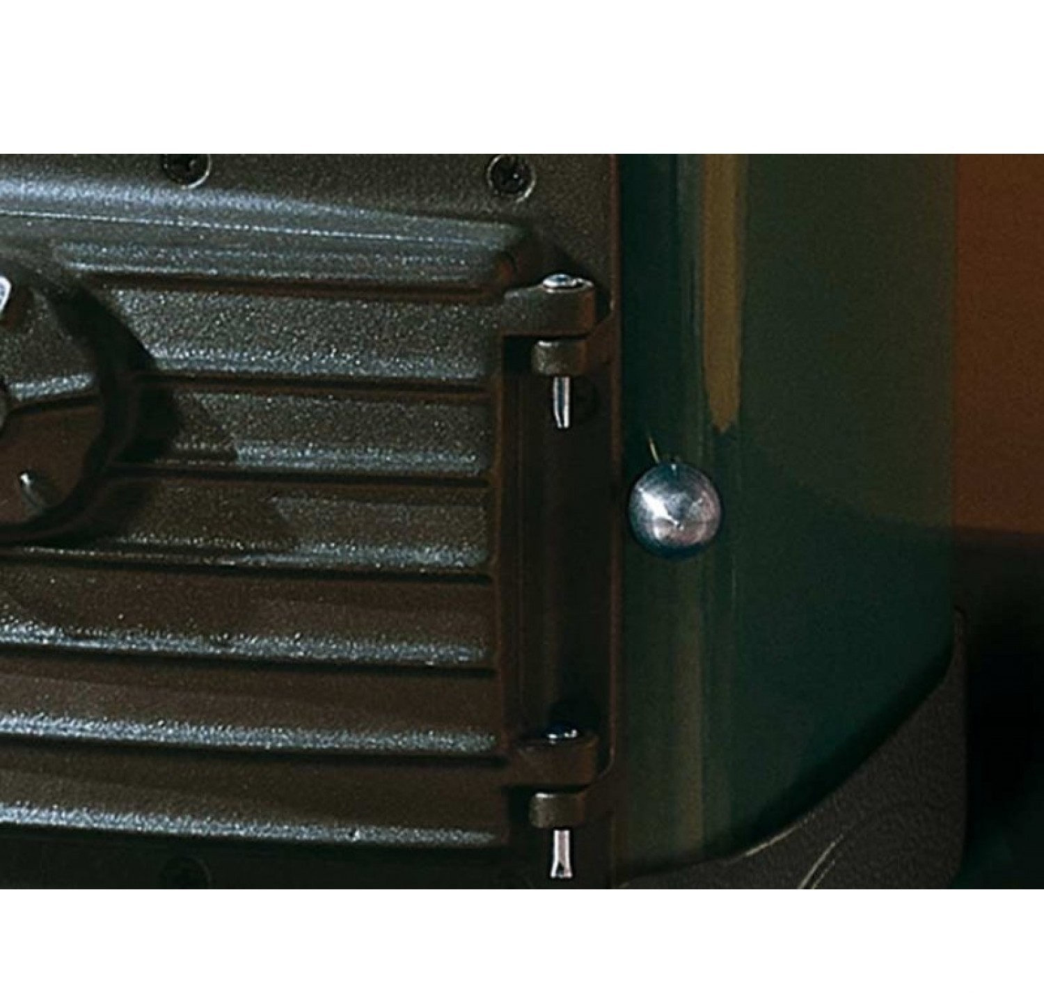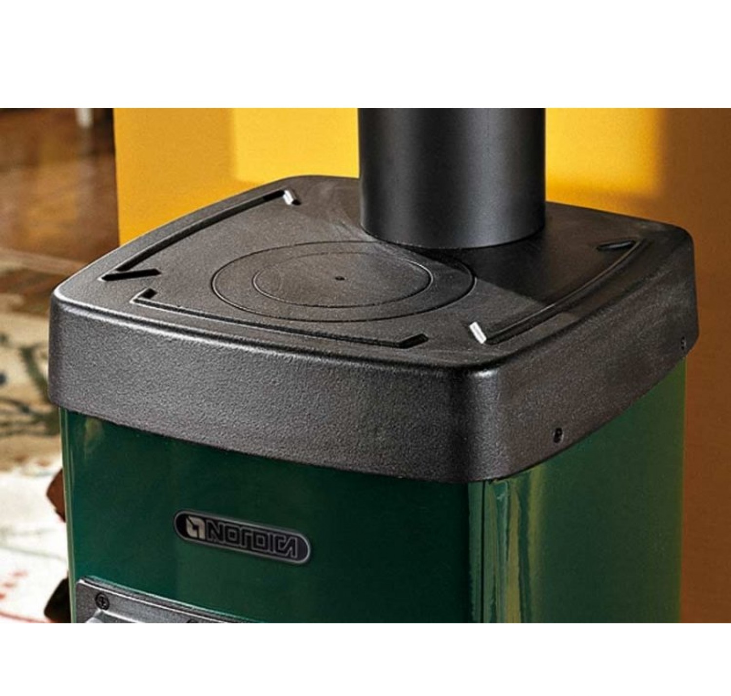Наружная поверхность печи покрыта матовой эмалированной сталью черного или зеленого цвета. Дверца и плита выполнены из чугуна . Панорамная дверь позволяет легко загружать топливо и любоваться живым пламенем. Важно отметить, что дверца может открываться книжкой.