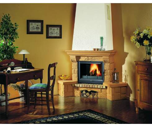 Угловой камин в стиле кантри из Эдельрока. На фотографии представлен камин с топкой Altima 105.