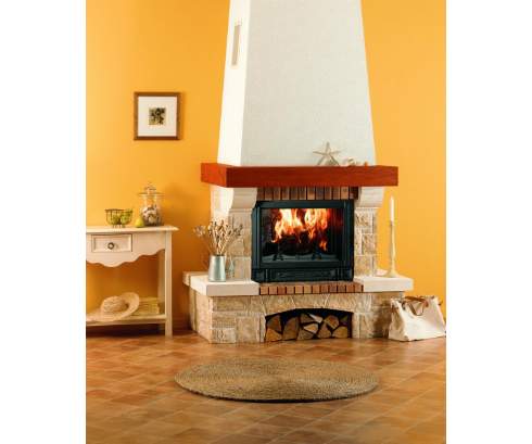 Пристенный камин в стиле кантри – необыкновенно уютный и теплый. Фронтальная модель Mancey76 изготовлен из натурального цветного бутового камня и белого камня. Внушительная балка из экзотического ироко украшает камин. Декоративное отделение для дров придает модели сходство с деревенскими печами.