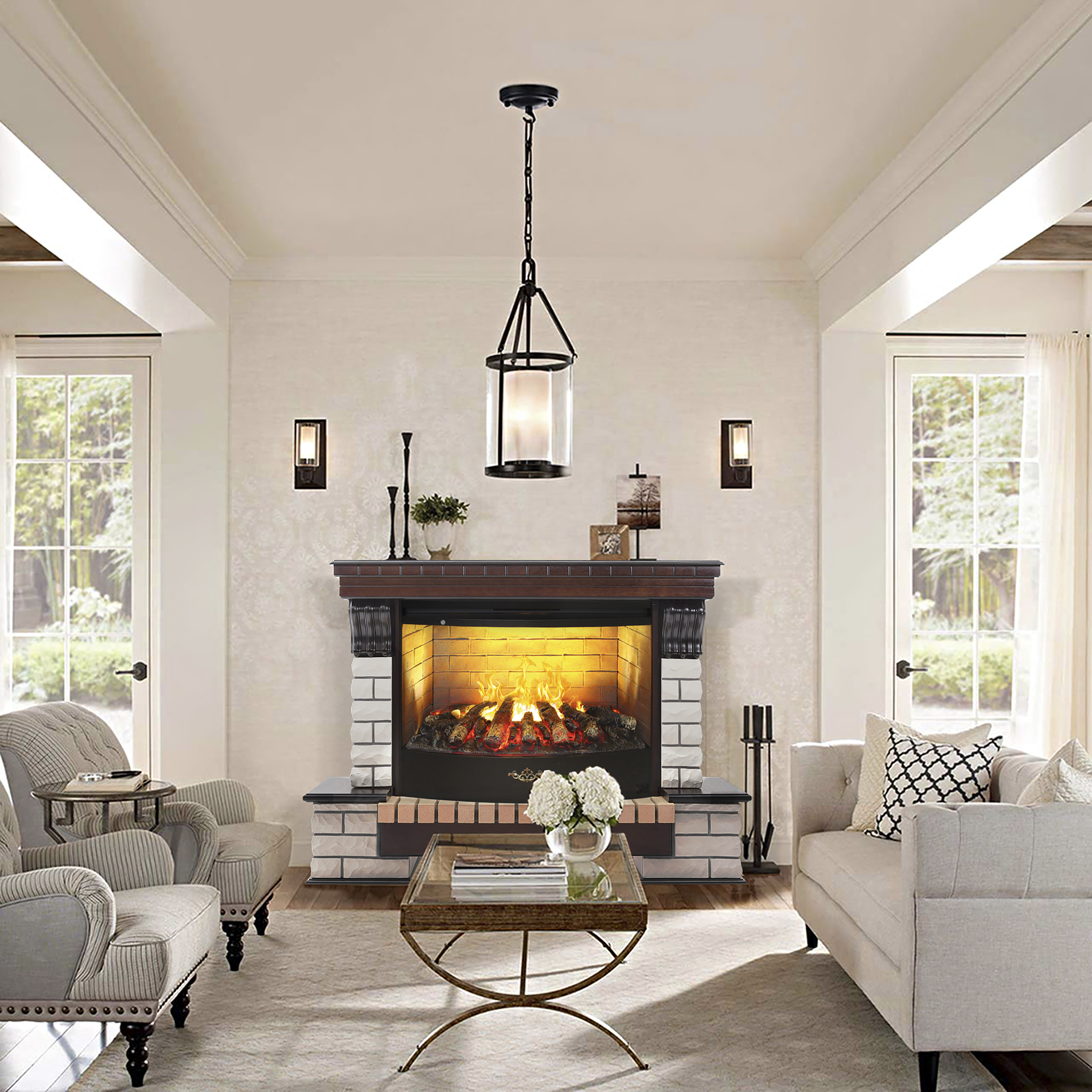 - Эффект пламени, не отличимого от настоящего, создается ультразвуковым парогенератором, вырабатывающим холодный водяной пар и муляжом дров, подсвеченным галогеновыми лампами.