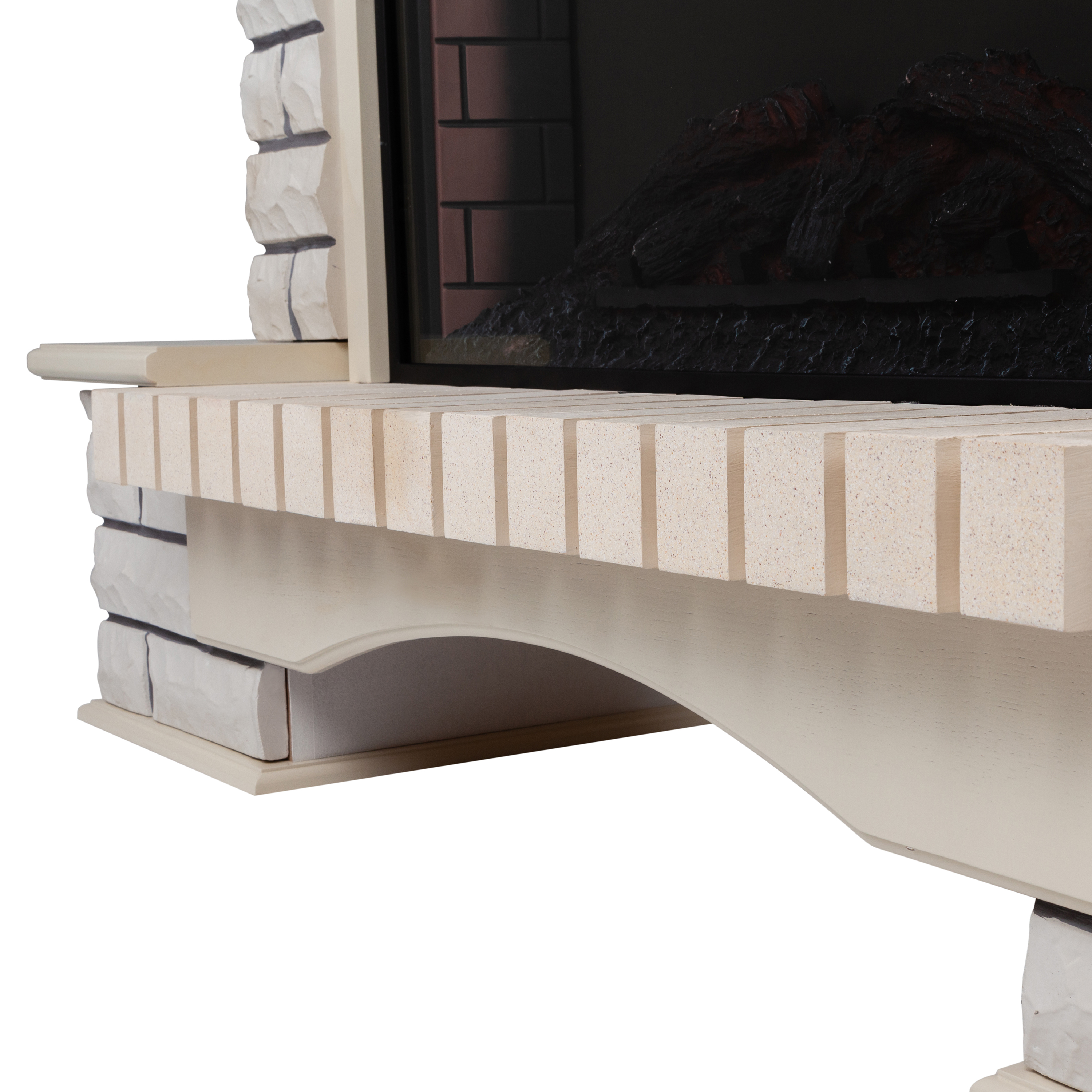 - Эффект пламени, не отличимого от настоящего, создается ультразвуковым парогенератором, вырабатывающим холодный водяной пар и муляжом дров, подсвеченным галогеновыми лампами.