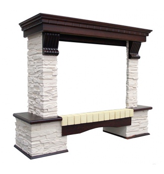 Модель представлена в нескольких вариантах, различающихся как по принципу установки (угловой или пристенный), так и цветовым решением облицовочного камня и деревянных элементов. Декорирована резными вставками в античном стиле.