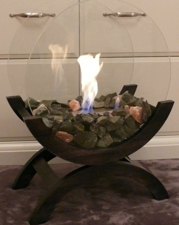 Firezo Diametro – это отдельностоящая напольная модель. Состоит из основания, изготовленного из дуба, корпуса топливного блока  из стали и два защитных термостойких стекла.