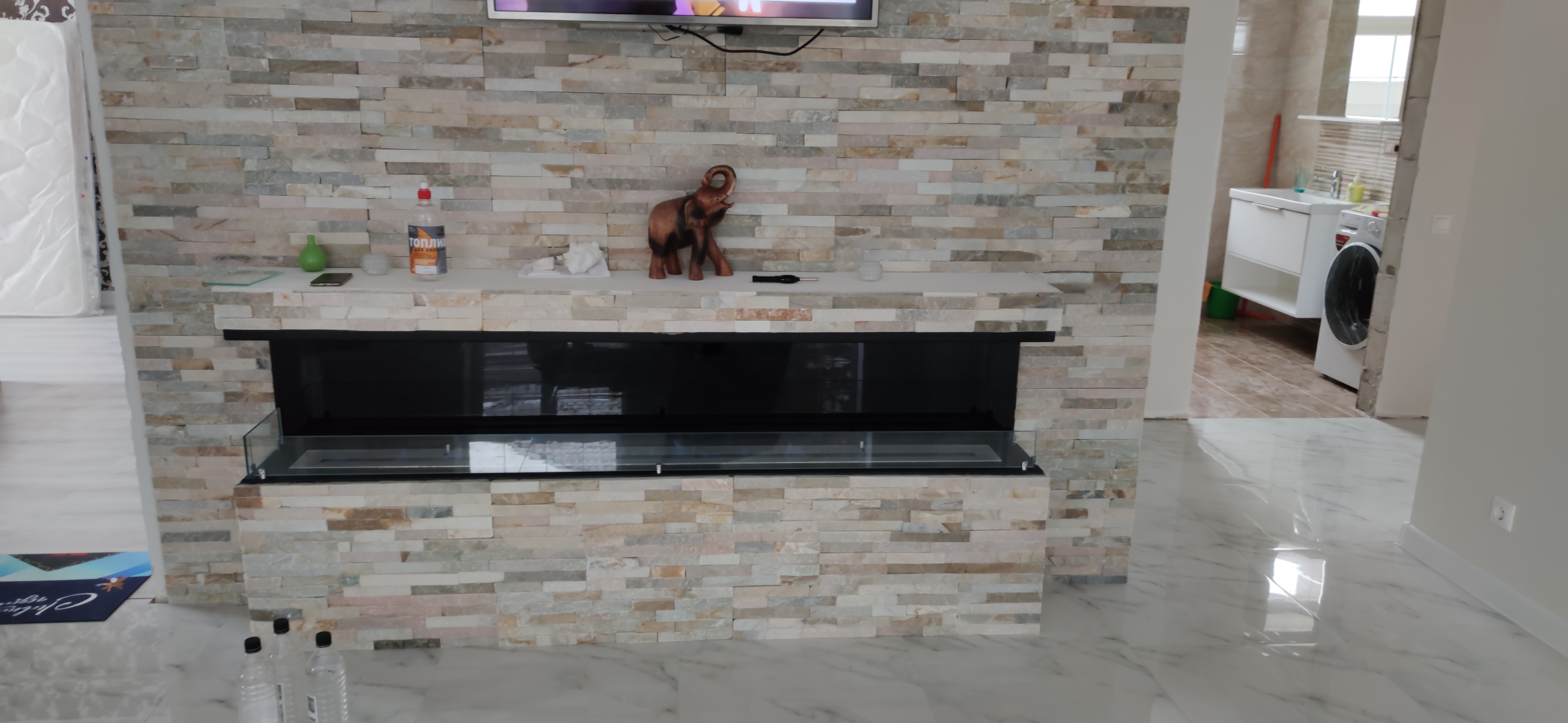 Встраиваемый биокамин с открытыми торцами Firezo Estremita в пригородном посёлке Воронежа изготовлен по индивидуальным размерам. Дополнительно вклеено в заднюю стенку тонированное стекло стемалит и защитное закаленное стекло по краям. Посмотрите что получилось со слов клиента Натальи