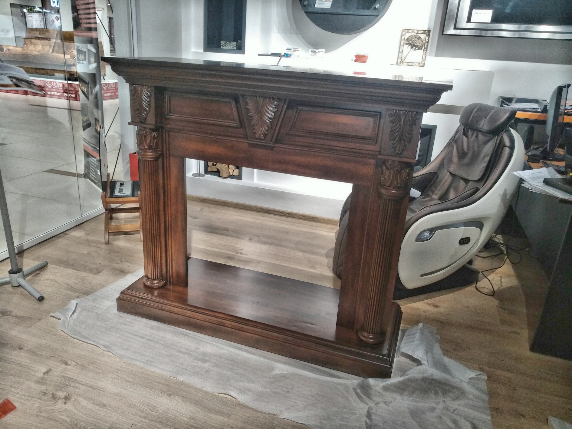 Мы привези, распоковали, собрали за 15 минут (Портал приходит в разобранном виде. Это очень удобно для транспортировки.) и установили шикарный портал Sheffield из МДФ и натурального шпона цвета грецкий орех.